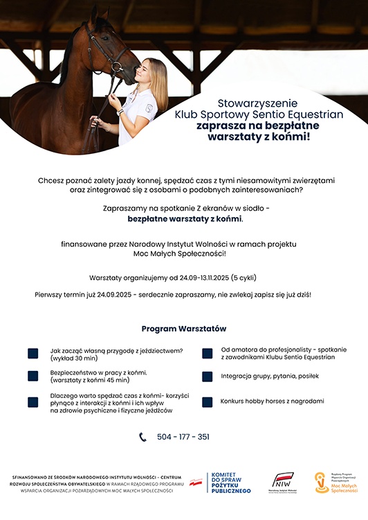W dniach objętych programem „Z ekranów w siodło” Sentio Equestrian przeprowadziło cykl bezpłatnych warsztatów, realizowanych w ramach projektu wspieranego przez Narodowy Instytut Wolności, w ramach programu „Moc Małych Społeczności”. Wszystko odbyło się w pięciu termnach (24.09.2025, 01.10.2025, 04.10.2025, 14.10.2025, 11.11.2025).