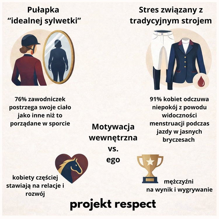 Percepcja własnego ciała może wpływać zarówno na pewność siebie zawodniczek, jak i ich gotowość do kontynuowania kariery sportowej. Zjawisko to jest szczególnie istotne w dyscyplinach jeździeckich, w których ocena zawodników ma charakter częściowo subiektywny, na przykład jak w przypadku ujeżdżenia.